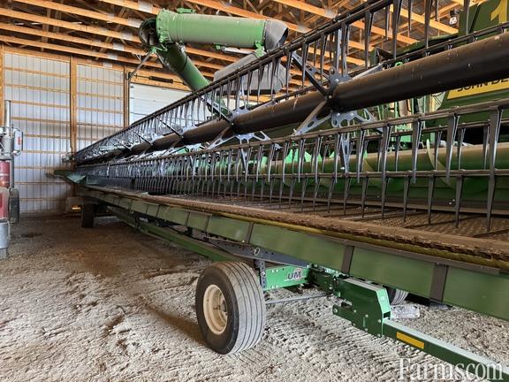 Specifications: 50 Feet; Flex/Draper; 50' HINGED DRAPER; "X" COMPATIBILITY; SHORT GUARDS; FINE TOOTH KNIFE WITH SHORT GUARDS; FINGERED TOP AUGER; GAUGE WHEELS; GRAIN SAVER BELTS; BELT PROTECTION SYSTEM; STANDARD REEL; CENTER SECTION SEAL KIT; COMPREHENSIVE POWERGARD EXPIRES JULY 31 2027 OR 1000 HOURS $250 CAD DEDUC; UNVERFERTH 4WS AWS 52' TRANSPORT WITH BRAKES (S/N A68970144);