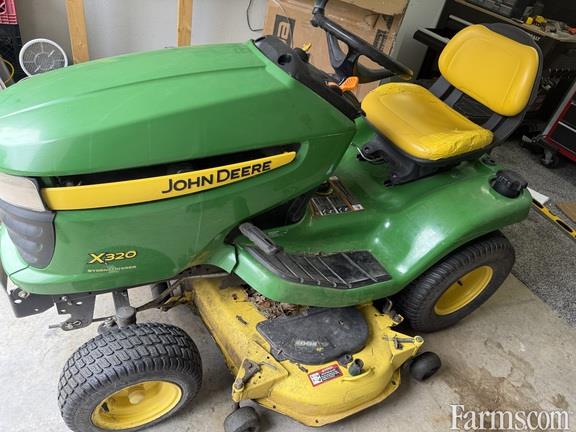 JOHN DEERE X320/48 LAWN TRACTOR, 2010, 22hp, Kawasaki, gas, v-twin, air cooled engine, twin pedal foot controlled hydrostatic transmission, cruise control, 48" side discharge mower deck, foot operated deck lift w/spring assist, 22x11-10 turf rear tires, 15x6.5-8 turf front tires.