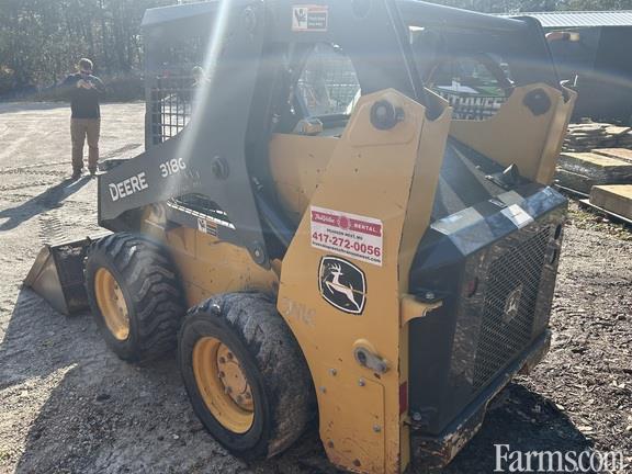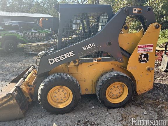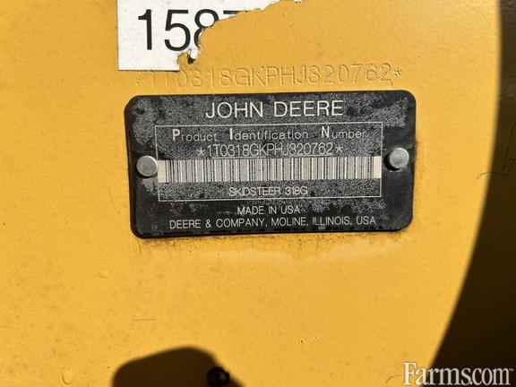 2018 John Deere 318G Skid Steer — Utility Package with EH joystick controls, two-speed drive, turbo engine, power quick-tach, standard hydraulics with self-leveling and ride control, air suspension vinyl seat, canopy (ROPS/FOPS), keyless start, deluxe lighting, and 72" construction bucket with edge.