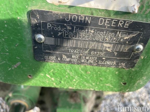 2018 John Deere 6135E Utility Tractor - 1,895 hours, 24/12 Power Reverser, MFWD, 540/1000 PTO. Standard cab w/ air suspension swivel seat. Triple deluxe SCVs w/ ISO breakaway couplers, 3-function mechanical loader-ready valve. Heavy-duty hitch, telescopic draft links, heavy-duty drawbar, sway chains. 460/85R38 rears, 380/85R24 fronts. Toolbox, instructional seat, eight rear wheel weights.