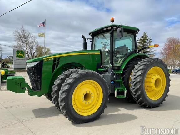 2018, JD 8400R, MFWD TRACTOR, 23SPD , 4600 DISPLAY, STD RADIO, 60 GAL PUMP, 5-HYDRAULIC REMOTES, CAT 4 HITCH, CAT 4 DRAWBAR, 480-50 75%, DUALS, ILS FRONT, 380-38 FRONT DUALS75%, STANDARD LITES, COLD WEATHER PKG, AUX HYD, BATTERY DISCONNECT, FRONT WT BRACKET/22 WTS. 1-PR 1400# INSIDE REAR, 1PR 165#AND 3 PR 450# O/S DUALS INTERIOR IS NICE