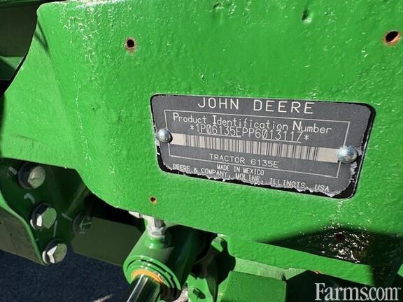 JOHN DEERE 6135E MFWD, CAB, UTILITY TRACTOR, 2023, 135hp, 4.5 liter 4 cylinder diesel engine, 24F/12R PowrReverser transmission w/ left hand reverser (25 mph), standard cab with right hand console, HVAC, cloth air suspension seat, rear view mirrors left and right, full access doors left & right, deluxe cab corner exhaust, AM/FM radio, GreenStar ready, NOT AutoTrac ready, NOT JDLink ready, wet traction & PTO clutches, independent 540 & 1000 rear PTO, 20 GPM open center hydraulic pump, 2 rear remote hydraulic valves with ISO couplers, loader ready with: 2 function joystick hydraulics for loader, hood guard, mid mount ISO couplers and loader mounting frames for H series loaders, Cat 2 three point hitch (5500#), telescopic draft links, hitch sway chains, flanged rear axle, MFWD front axle plus rear differential lock, front weight support with 6 weights, flanged rear axles, 8 position steel rear wheels, 480/80R38 R-1 rear tires, 380/85R24 R-1 front tires, FULL JD FACTORY WARRANTY UNTIL 11-01-2027 OR 2000 HOURS.