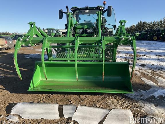 Specifications: Single point hydraulic hookup; mechanical self leveling; loader suspension; five tine grapple; 96 inch bucket; global carrier;