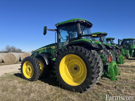 AVAILABLE SEPTEMBER, JOHN DEERE 8R 340 MFWD, CAB ROW CROP TRACTOR, 2025, 340hp, 9 LITER, 6 cylinder diesel engine, 110V coolant heater, JDLink MTG, Autonomy Ready Package, 330 amp alternator, e23 (23F/11R) powershift transmission (25 mph) with efficiency manager, right hand reverser w/ bump to shift controls, Ultimate cab with active II seat, HVAC, Ultimate comfort and convenience pkg, dual electric adjust mirrors, active leather air suspension seat, leather folding buddy seat, touch screen AM/FM radio, auto temp control, business radio ready, refrigerator, ultimate visibility upgraded LED lighting, LED beacon lights, integrated front & rear cameras, load sensing hydraulic power steering, back-up alarm, dual G5 Plus CommandCenter 12.8" displays with permanent licenses for AutoTrac steering, RowSense, Section Control, Data Sync, Over Air updates & Remote Display Access, renewable SF1, 3 year license for Implement Guidance, Turn Automation, AutoPath, Data Share & Machine Sync, includes integrated Starfire 7500 global position receiver with SF-RTK, 1 year renewable license (accuracy subscriptions required), rear implement ethernet, 84 GPM dual hydraulic pump, 5 rear remote hydraulic valves with ISO couplers and high pressure relief levers, auxiliary case drain coupler, power beyond pressure coupler & load sense coupler, independent 1000 RPM (1 3/4") rear PTO capable of 540 or small 1000 PTO with purchase of additional shafts, Cat 4N three point hitch (20,000#) with quick coupler, Cat 4 adjustable HD (11,000#) drawbar (2" pin), ILS (independent link suspension) MFWD dual ready front axle, pivoting front fenders, front weight support with 16 front weights, 900# cast rear wheel weights, 118"x120mm rear axles with double taper hubs, rear differential lock, rear fender extensions, dual Firestone 380/80R38 R-1W front tires, dual Firestone 480/80R50 R-1W rear tires, FULL JD FACTORY WARRANTY UNTIL 07-19-2027 OR 2000 HOURS. JD EXTENDED ENGINE/POWERTRAIN WARRANTY UNTIL 07-18-2028 OR 1500 HOURS ($500 deductible).